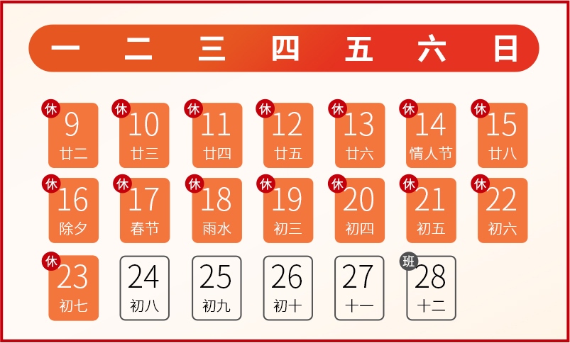 注:2月28日(周六)調(diào)整為工作日,正常上班。