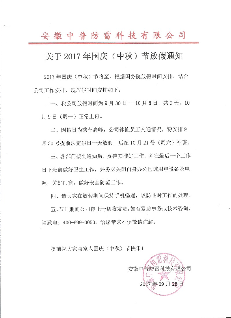 關(guān)于2017年國慶(中秋)節(jié)放假通知