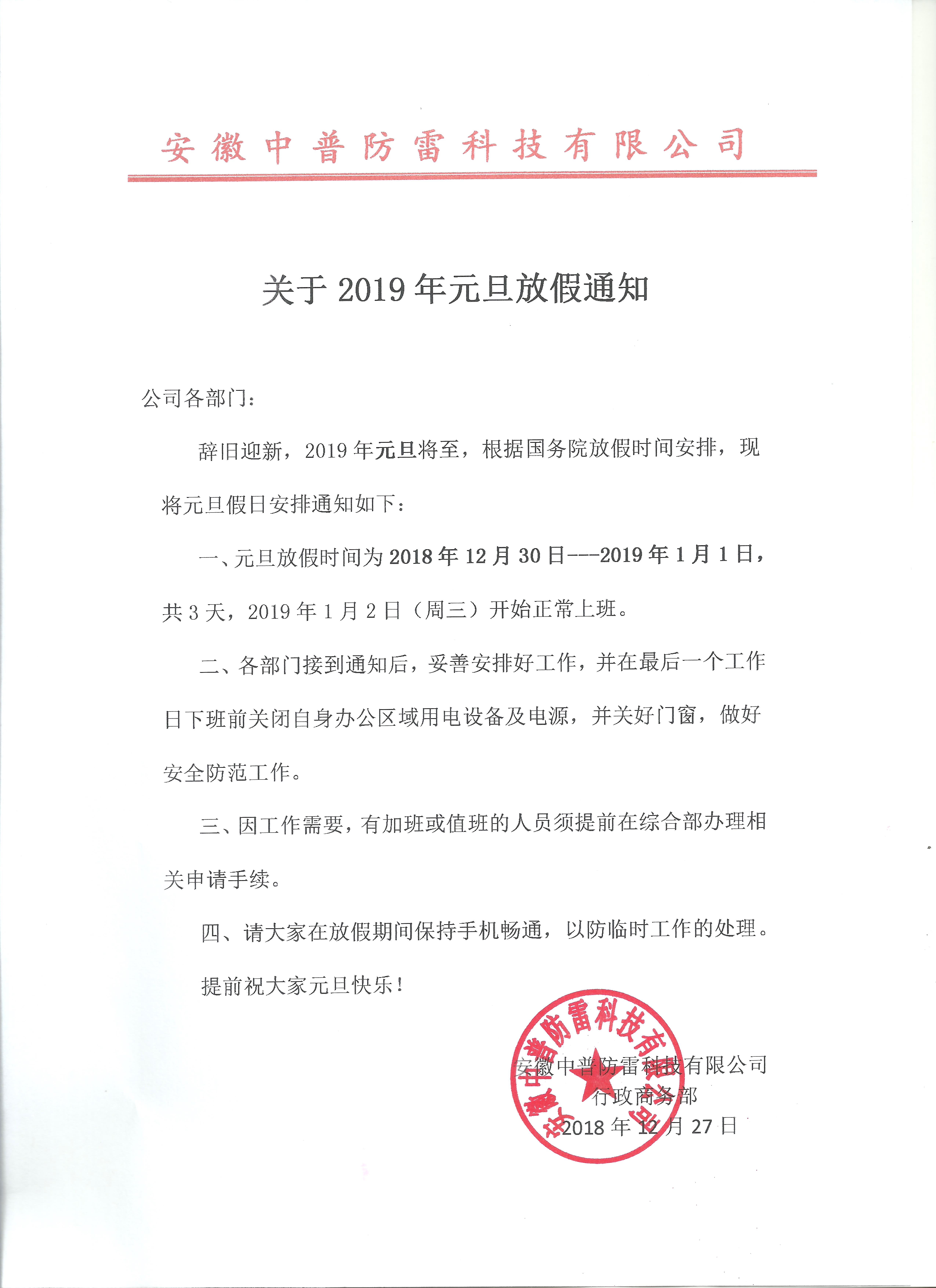 安徽中普防雷“關(guān)于2019年元旦放假通知”