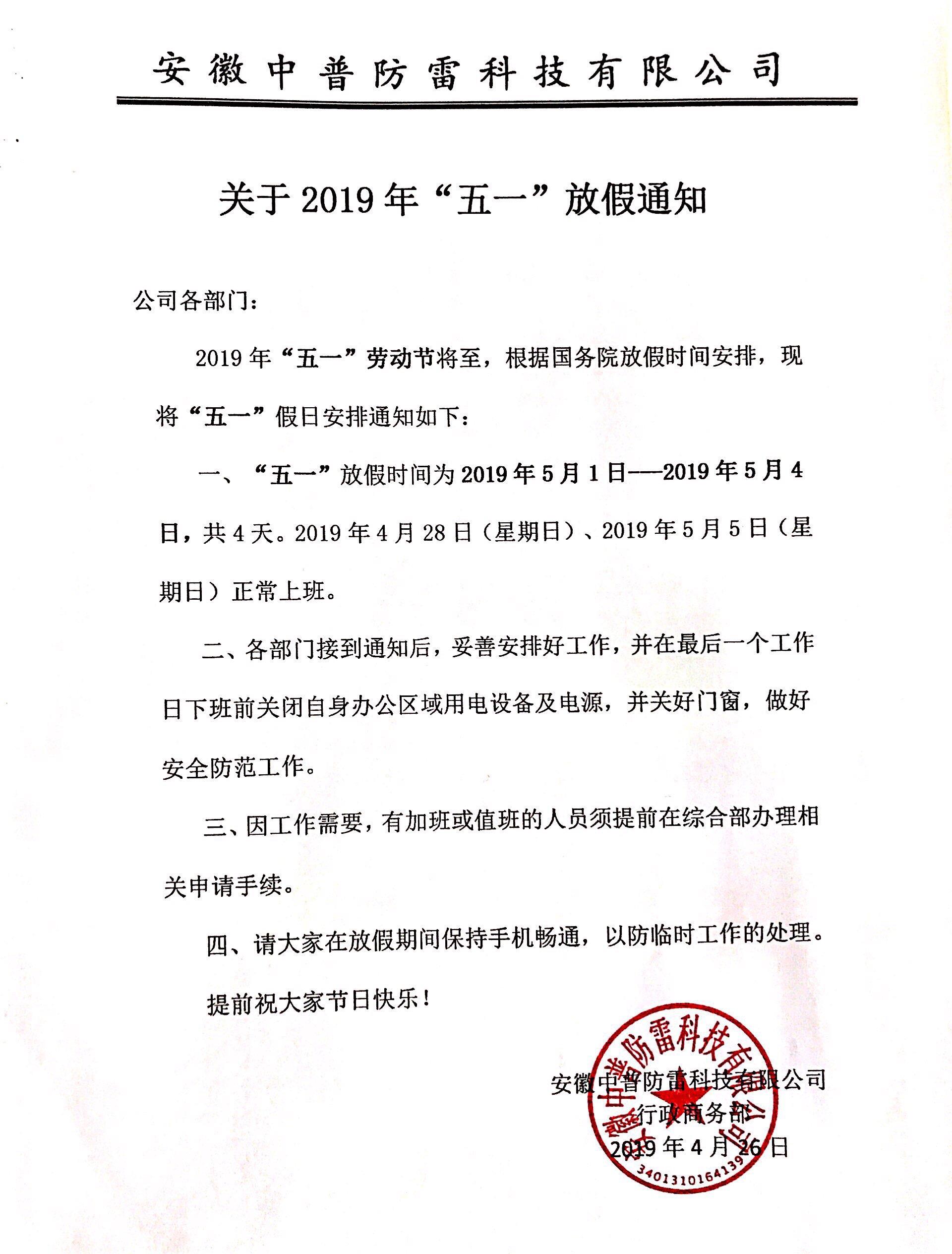 安徽中普防雷“關(guān)于2019年五一勞動節(jié)放假通知”