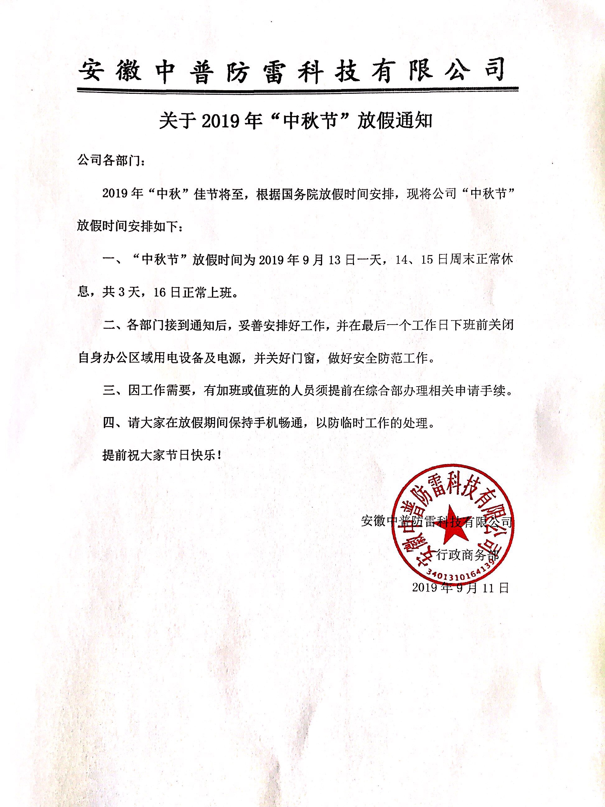 安徽中普防雷“關(guān)于2019年中秋節(jié)放假通知”