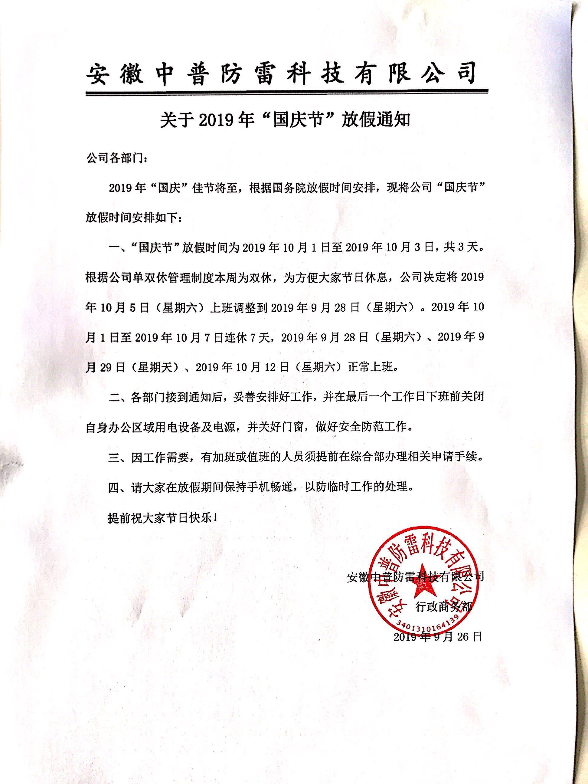 安徽中普防雷“關(guān)于2019年國(guó)慶節(jié)放假通知”